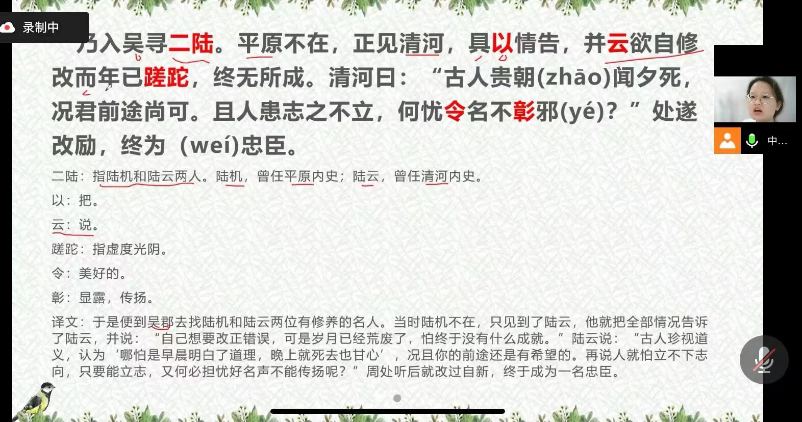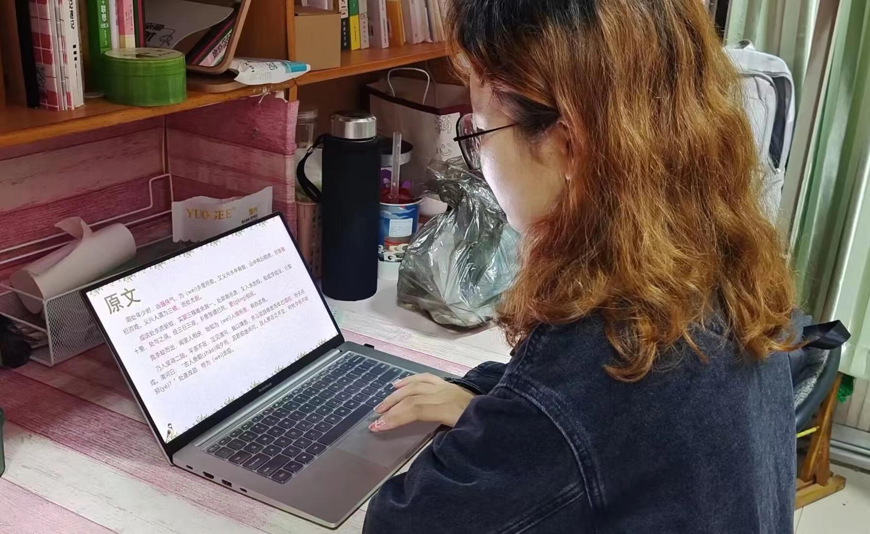 志愿者们借助腾讯会议,围绕“周处除三害”展开了详细的讲解。志愿者们首先简单介绍了周处的人物背景,随后通过朗读课文的形式纠正同学们的读音问题。课堂上,志愿者采取重点标红、易读错字反复强调、字字落实翻译、随机抽取同学提问等方法为同学们细致地讲解课文。在课程的最后,91看片