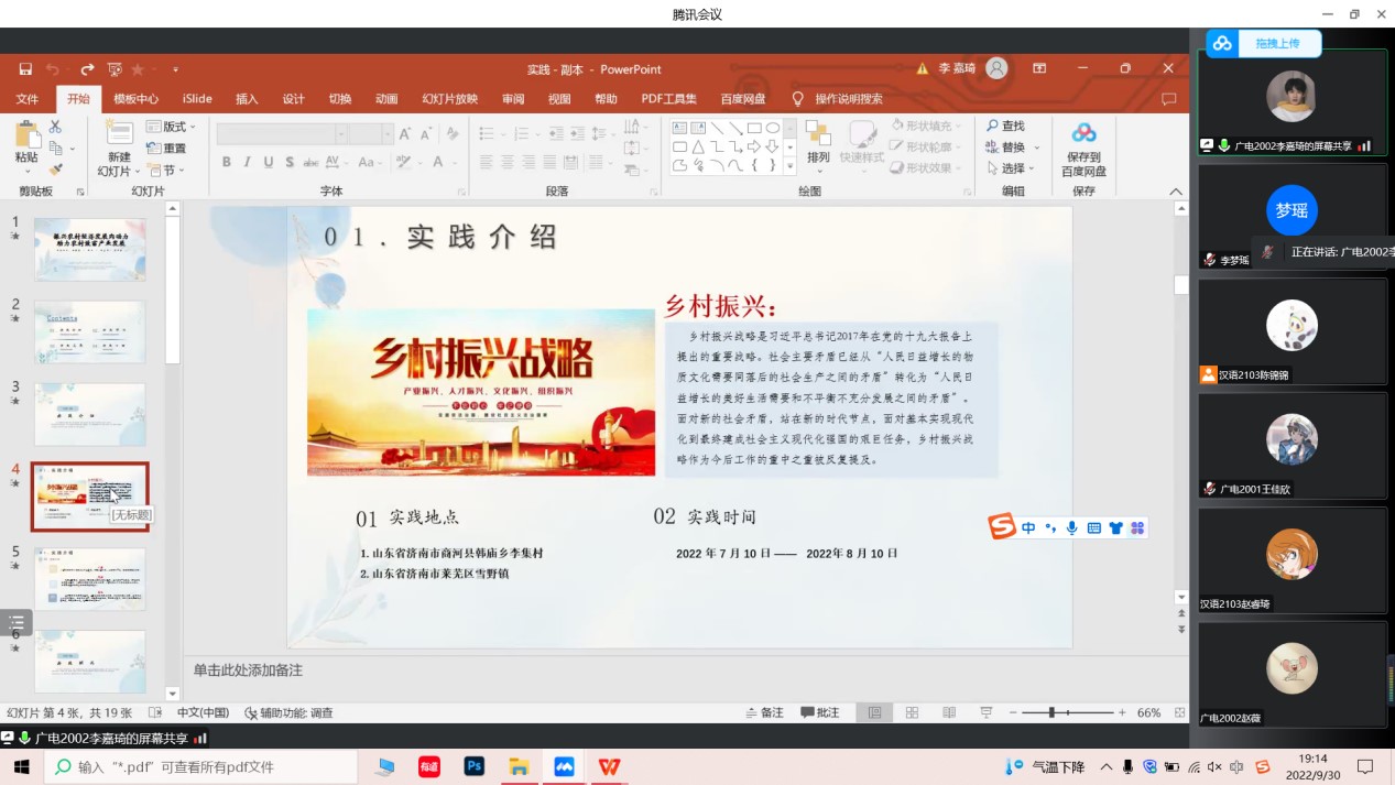 于2022年9月30日晚以腾讯会议的形式召开暑期社会实践优秀经验分享会。