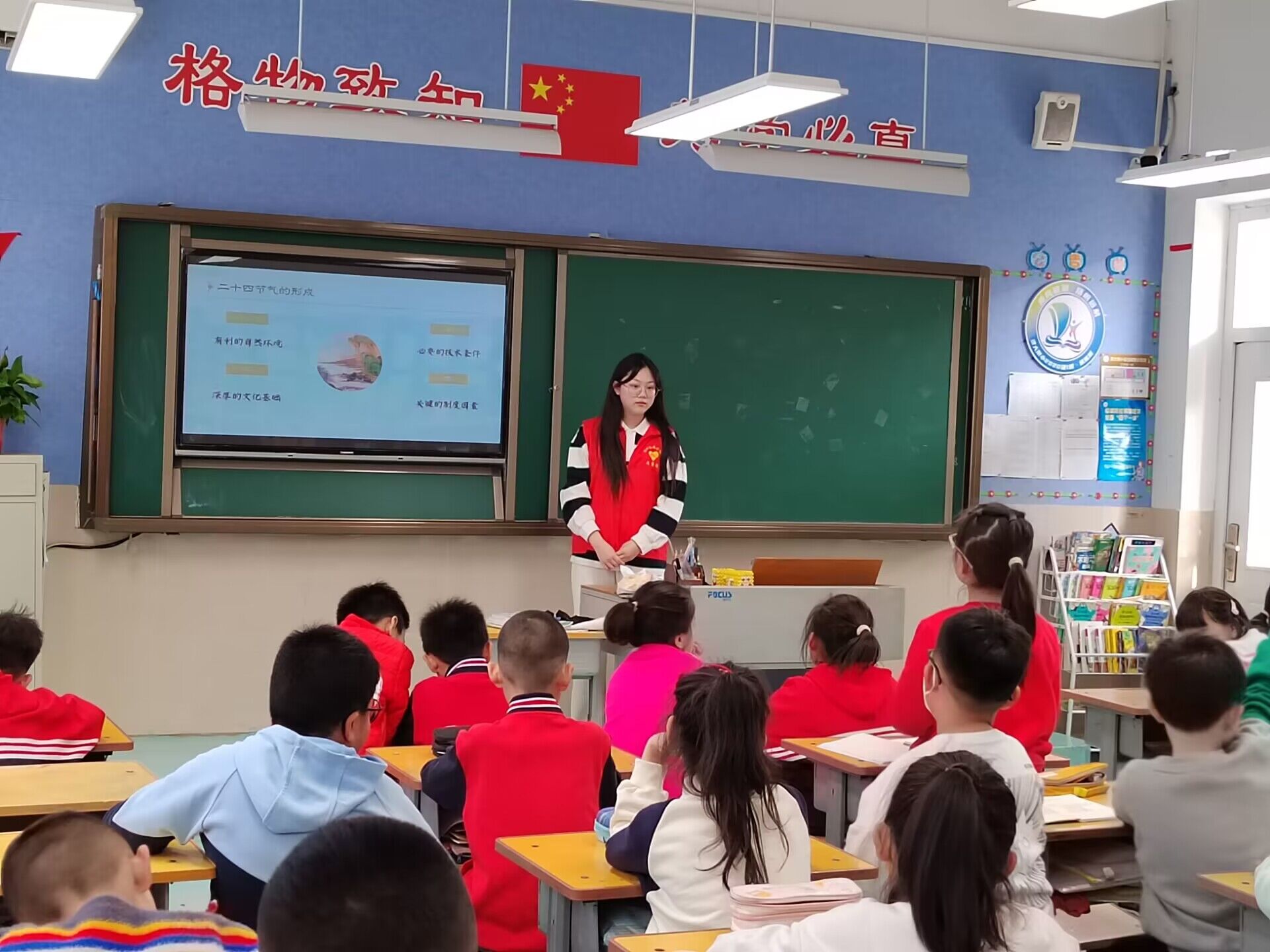 活动开始前,志愿者们就二十四节气有关知识进行了细致的搜集与甄别,并就选材与内容进行相关讨论和整理,为活动开展做好充分准备。在授课活动过程中,志愿者首先对二十四节气进行了简要介绍,包括其由来、形成原因、组成及用途等。使学生们对二十四节气有了初步的认识。课上,志愿者以互动问答的形式,帮助孩子们将二十四节气与古诗词联系起来,并以图文并茂的方式进行了新的阐述与讲解。讲解妙趣横生,角度新颖,成功地引领孩子们探索了二十四节气的奥妙。最后,志愿者对二十四节气的意义与地位作了详细又生动的讲述,激发了孩子们对中华传统文华的认同与传承意识。同学们积极回答问题,课堂氛围良好。活动结束后,同学们为志愿者们献上了热烈的掌声。