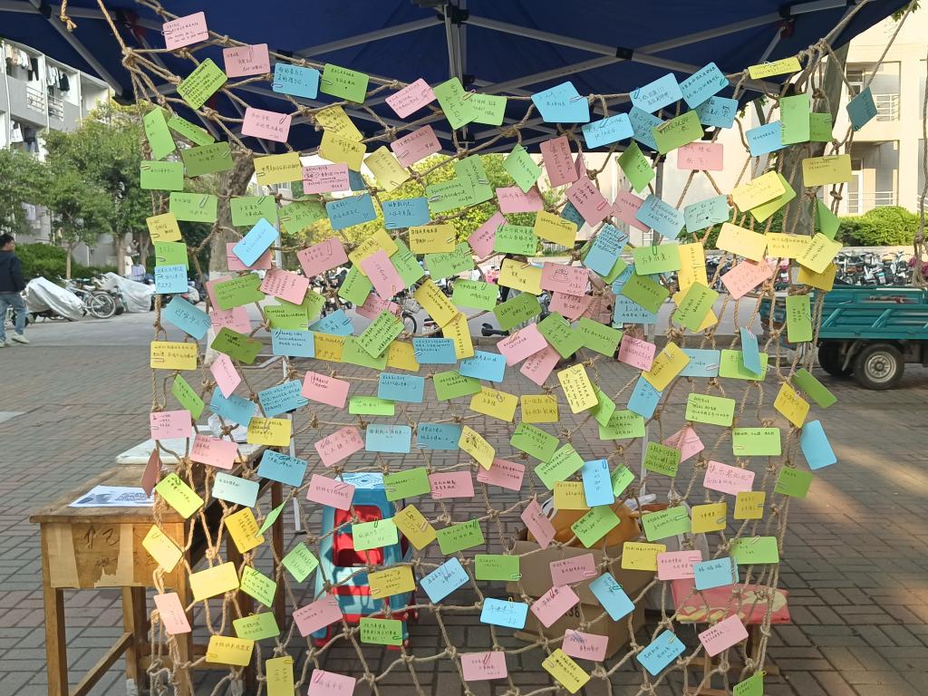 活动开始前,为了应对不同情况的发生,志愿者们经过严谨的策划讨论,制定出了多种备选活动方案,以保证活动正常进行。同时,在学院和协会的大力支持下,志愿者们为本次活动购入了充足的活动物资,包括玩偶服、徽章、装饰品等,为活动提供了物质保障。活动正式开始后,身着玩偶服的同学迅速进入状态,积极热情地同参与活动的同学互动,现场氛围十分活跃。同学们情绪高涨,和玩偶挥手、拥抱、合照,并且在心灵展板上写下了自己的愿望和祝福,原本空荡荡的绳网被同学们的愿望卡片点缀得色彩纷呈,本次活动圆满结束,受到同学们一致好评。