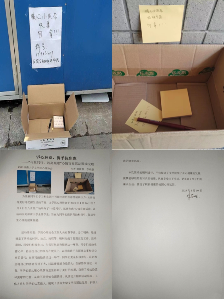 心理协会于2023年4月26日至5月20日在八食堂广场举办了“与爱同行,远离焦虑”心情盲盒活动,该活动面向91看片