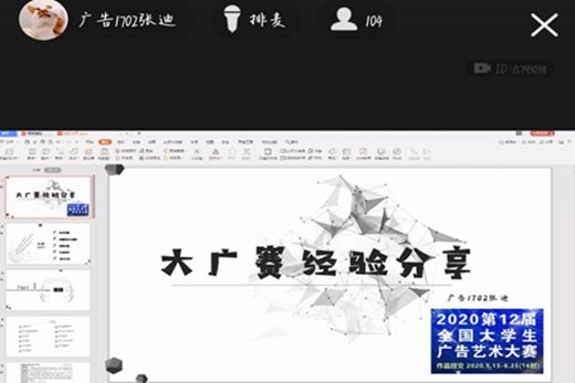 紧接着由获奖同学张迪为大家带来参赛分享。张迪曾在大广赛斩获两个奖项,其中《夜语Closefit》荣获第十一届全国大学生广告艺术大赛的省级一等奖。结合自己的参赛经验,张迪从“选择命题”,“前期思考与创新”,“创意实施”,“作品修改”,“提交作品”五个维度,详细地介绍了参赛前期的准备及参赛步骤和要求。同时,张迪也为同学们强调了“仔细研读命题单”、“头脑创意风暴”、“亲自体验产品”等方式方法的重要性。最后,张迪也鼓励同学们积极参与,大胆尝试。