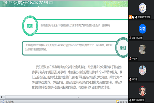 团队六人,备战十天,聚焦热点,服务团队为农村地区的学弟学妹们备好资料,以便咨询。在立项之初,团队面对着两个不同的选择:高考志愿填报or研究生志愿填报,这是一个值得团队成员思考的问题。在服务小组的队员们看来:“一个是我们已经逝去的曾经,一个是我们即将面对的未来”。选择似乎不是一件容易的事情,最终,团队通过票选确定了项目方向—高考志愿填报服务。项目方向确定,团队分工明确。团队负责人汪雨欣总体统筹,负责项目工作划分、微信公众号推广和最后问卷分析及后勤准备;开朗大方的曹江艳同学挑战自我,积极筹备项目问卷内容,每一个问题都是精雕细琢之后的慎重抉择,为项目的顺利进行打好了重要基石;参赛经验丰富的李孟祺同学积极和身边的农村高考学子沟通交流,了解他们对于高考志愿填报的期许;文字编辑小能手刘蔷积极收集相关高考资料,为团队确定搜索方向,明确服务内容;郭盛哲和刘长惠两位才女为团队高考志愿填报项目添砖加瓦,积极协助团队其他成员完成文字编辑、审查以及项目前景和社会价值考察等重要工作。合作让这个项目的每一份经络都可以得到悉心的呵护,每一份成果的凝结都离不开团队六人的精心孵化。