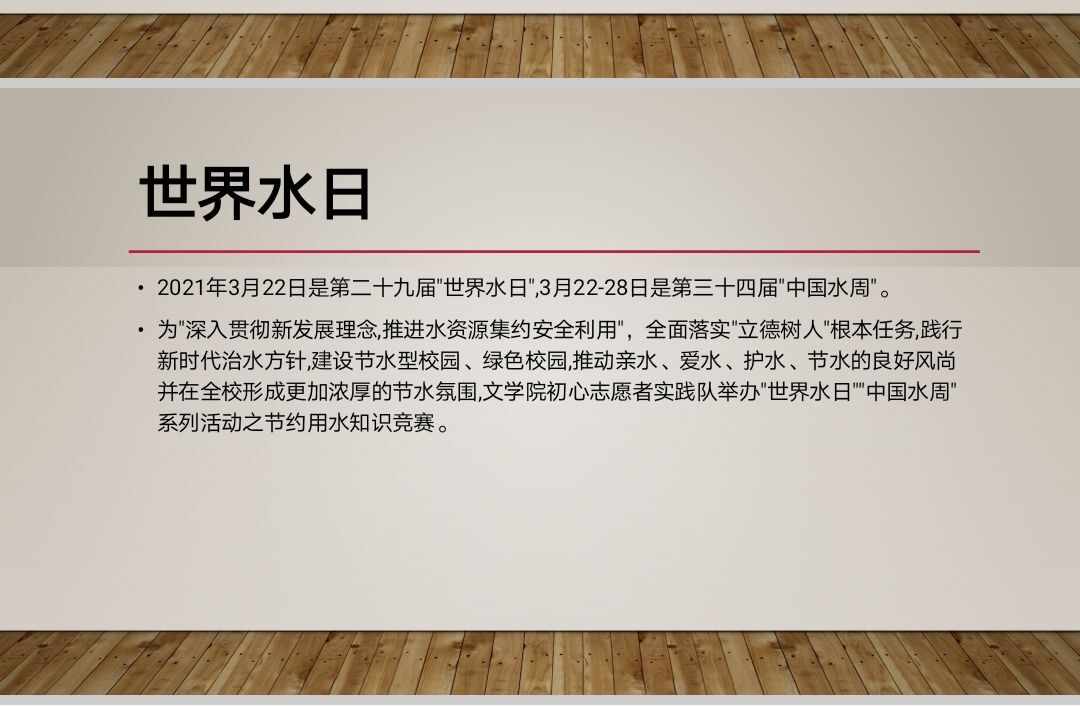 2021年3月22日是第二十九届“世界水日”,3月22-28日是第三十四届“中国水周”。为提高同学们的节水意识,推动形成亲水、爱水、护水的良好风尚与更加浓厚的节水氛围, 3月25日晚上7点,91看片