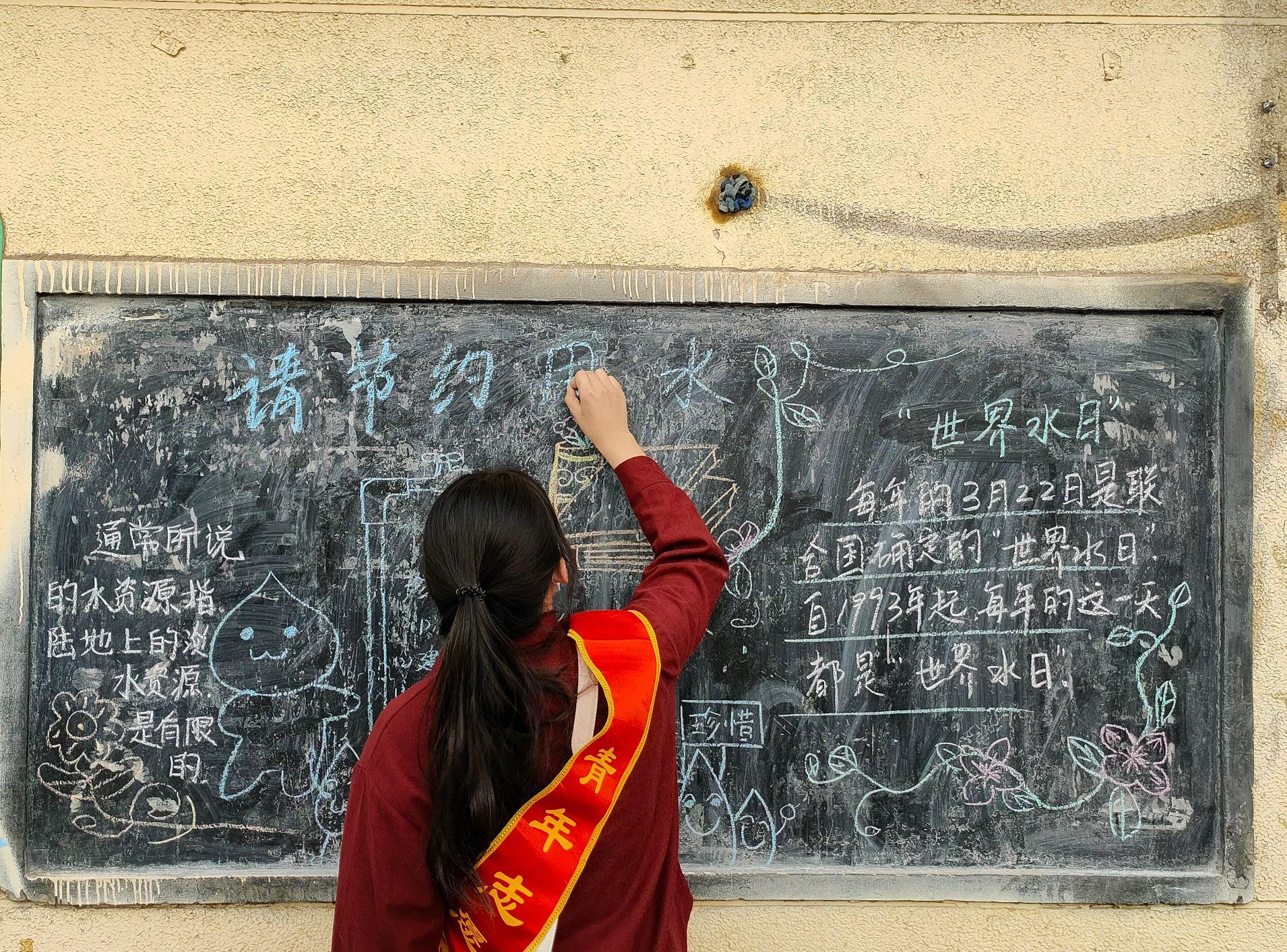 学生党员就活动前期准备工作以及黑板报主题进行了多番分析讨论,在明确了水资源保护这一主题后,志愿者内部以及参与活动的学生党员进行了分工,并对活动流程进行了梳理。3月28日下午三点,社区队志愿者们以及学生党员在校门口集合,活动成员一同前往王官庄社区。到达活动地点后,志愿者和学生党员积极参与活动,大家发挥自己的优势,字迹工整的同学负责板报的文字部分,绘画水平高的同学则负责板报的插画部分,大家各司其职,再加上91看片