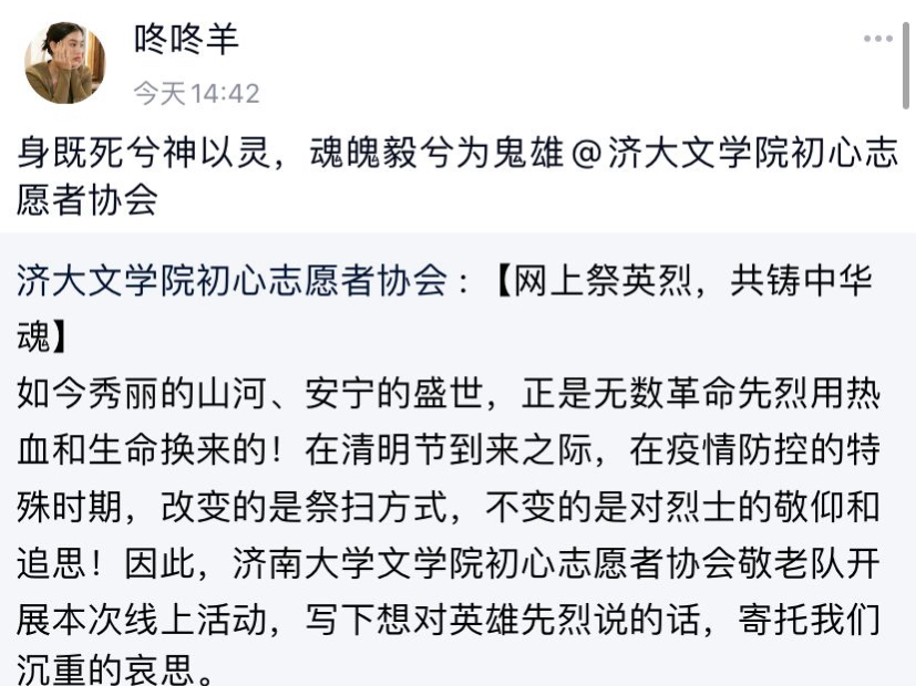 志愿者协会工作人员充分考虑清明节时期的节日特征,结合疫情当下学生们的心理活动,确定了活动主题,并广泛宣传。活动过程中,同学们积极参与,通过在QQ空间发表动态的方式缅怀先烈,讲述先烈的伟人事迹,用文字传达了怀念与哀思。本次活动积极跟进,前期宣传收获了广大同学的热情支持,讲述伟人事迹,用文字表达哀思,传承百善孝为先的中国优秀传统文化,在和平的年代不忘感谢为我们生存和发展做出巨大贡献的英雄们。