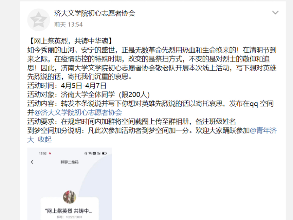 初心志愿者协会于2022年4月6日面向学校全体同学举办“清明线上缅怀先烈”活动,呼吁同学们网上祭英雄,共铸中华魂。