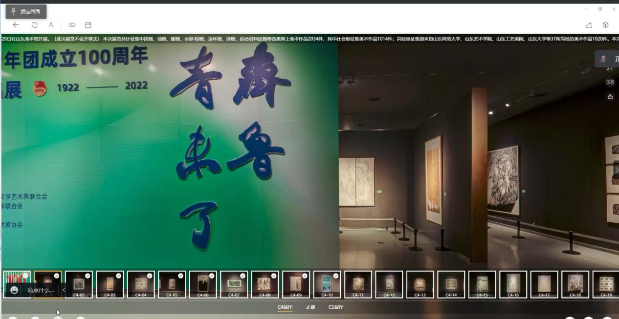 本次系列作品展包括美术、书法、摄影三项展览,伴随着悠扬的背景音乐,同学们共同进入了线上VR全景展厅,观看了《如果颜色有信仰、那一定是中国红》、《黄河湿地之印象》、《丽日欢歌》、《畅园九韵》等艺术作品,山东孕育了齐鲁文化,哺育了勤劳勇敢的山东人民,在山东省新冠肺炎疫情防控的当下,创作者们纷纷用优秀的作品振奋艺术精神,温暖人心,为打赢疫情防控阻击战贡献力量。在一幅幅艺术作品中,同学们体会到了无与伦比的人文之美,感受到了艺术的熏陶。