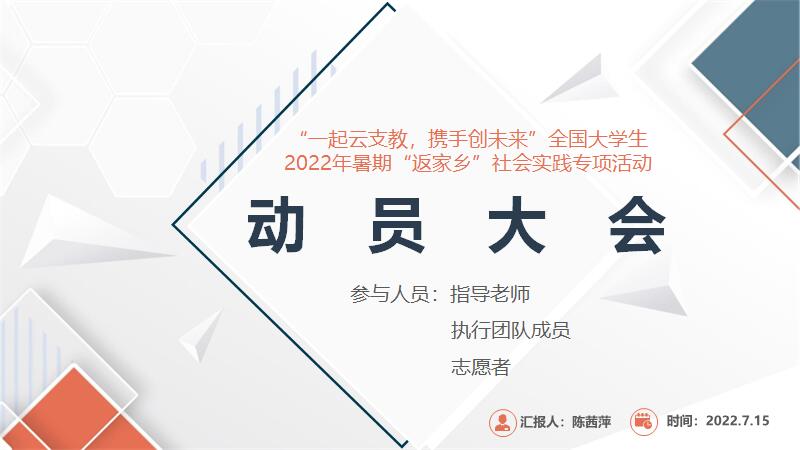 为进一步提高大学生志愿者参与云支教的能力和信心,营造社会实践氛围,提升志愿服务质量,7月15日,我校召开线上2022暑期“返家乡”社会实践“云支教”大学生志愿者动员大会,大会由活动执行团队主持,91看片