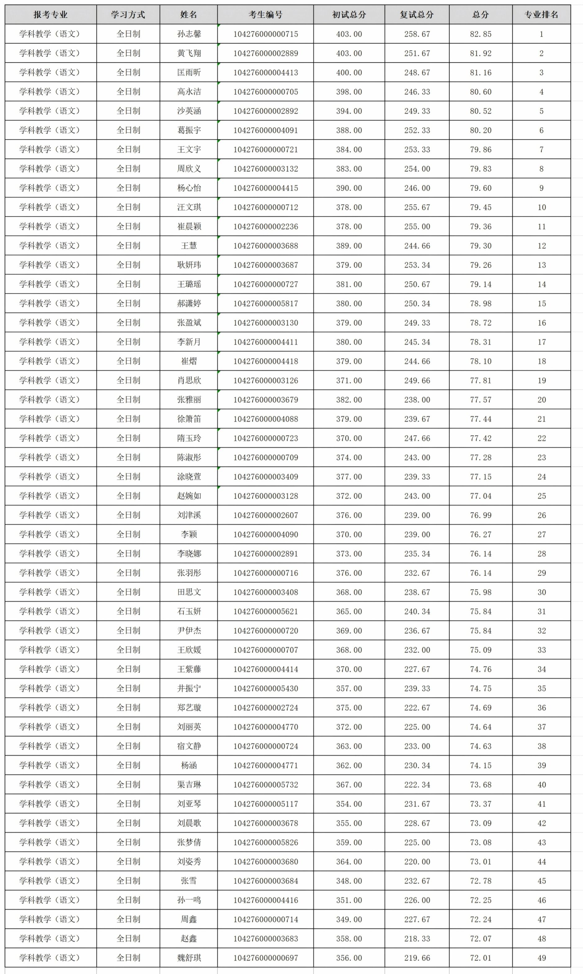 现将(050100)中国语言文学、(045103)学科教学(语文)、(055200)新闻与传播、(055300)出版硕士研究生一志愿批次考生成绩予以公示。