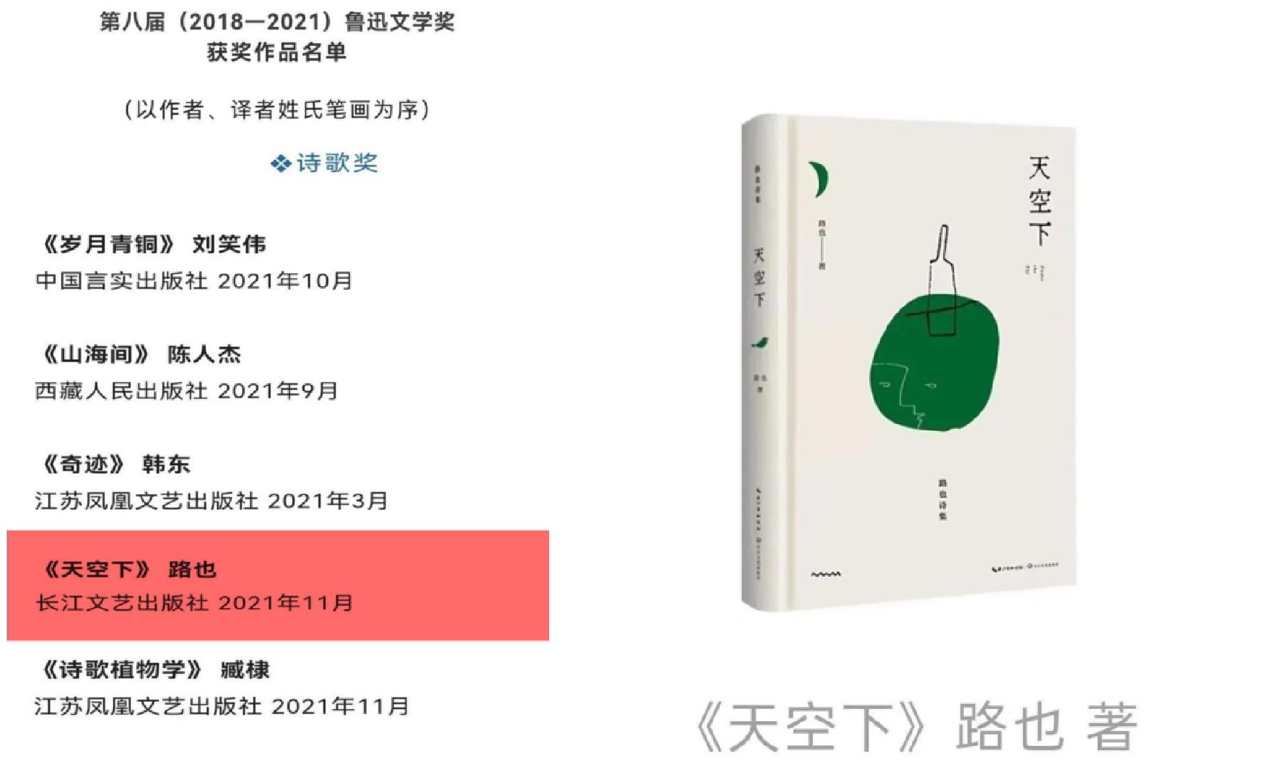 路也教授获奖的作品《天空下》,于2021年11月由长江文艺出版社出版,是其近年创作的诗歌精选集,以2018年至2021年创作的最新作品为主,并甄选了少量早期的代表作。这是一部怀抱热望、充满知性与智性的诗集,诗歌对事物的深入体察,对词与物关系的精妙把握,呈现出深邃、阔达的诗意。书中,多次使用了“天空”的意象,诗人认为:“我个人很喜欢天空的意象,喜欢天空要远远超过喜欢大地,所以诗集取名《天空下》。”天空在上,深情注视世间万物。天空下,诗人以观察、知觉和天启的方式来获得个体生命经验,并将之整合成为灵魂的旋律,所以,这也是一部形而上的、通往心灵之路的诗集。全书分为三辑:第一辑写生活中的细微之思;第二辑则是一部游历之书,写的是个人内心冲突和个人心灵图景在自然风物上的投射;第三辑由两首长诗组成。诗人自如地穿梭于大自然和日常生活间,注重从大自然和历史中获取新的审美,着力于日常生活的细细咀嚼,反刍经验。这些诗,直面日常、还原生活,显现出厚实的结构和情景交融的饱满形象,折射出整个世界和人生。正如作者所言,“文学写作是我在这个世界上探索真理的一种方式,这是我喜欢的方式。”这些作品属于作者中年转型之作,这些诗歌从过去关注“女人”转移为关注“人”,她的诗比从前更加宽厚、包容、轻松、旷达、开放。这部诗集中的长诗作品也颇具代表性,长诗《徽杭古道》写的是一条自然之路、人文之路、历史之路、时间之路、信仰之路,而长诗《巧克力工厂》,似乎隐喻式地表达了诗人对于艺术作品生产机制的思考,传达出了一个优秀诗人的沉着、幽默和尊严。