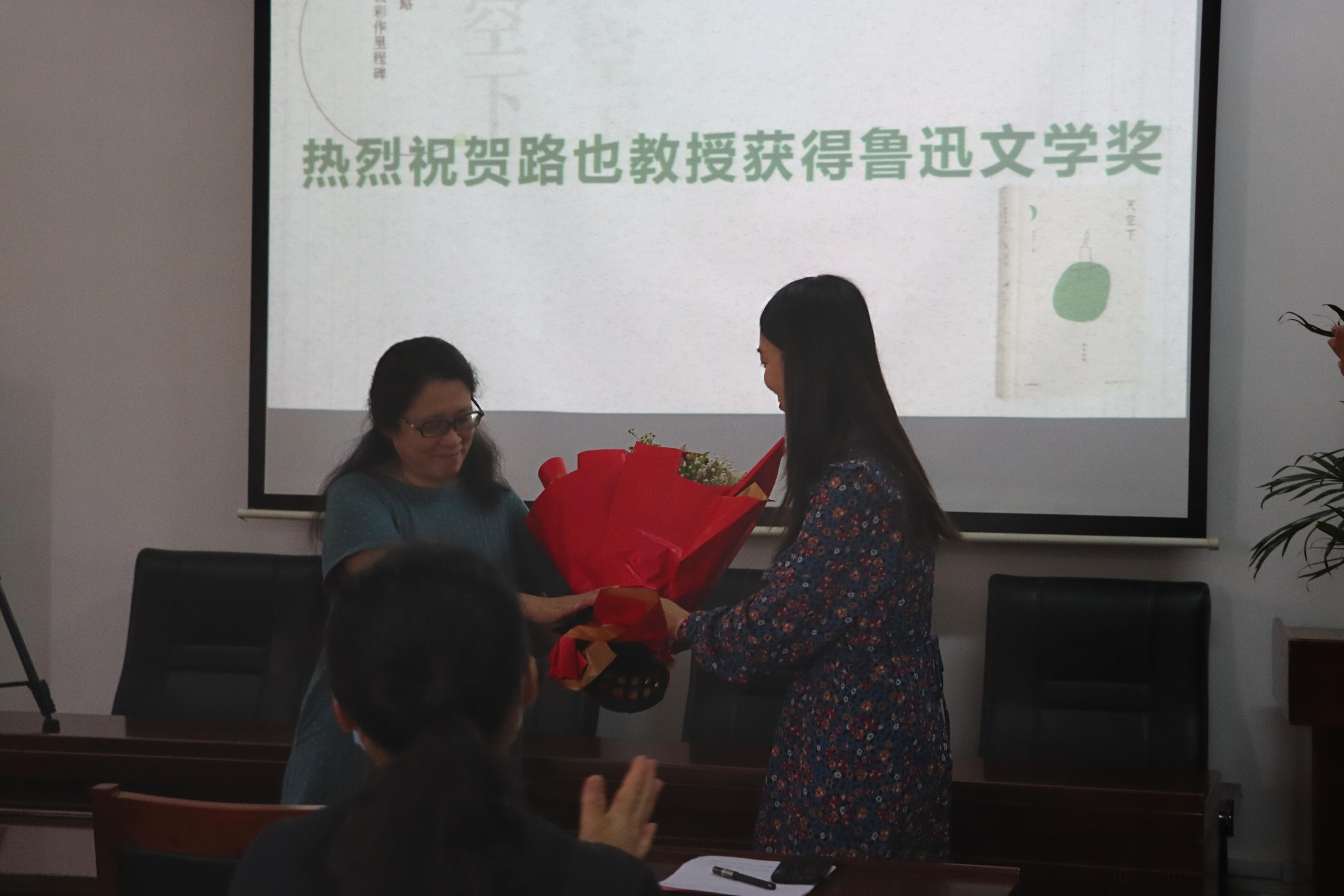会上,路也教授向大家分享了创作心得,并表示“文学写作是我在这个世界上探索真理的一种方式,这是我喜欢的方式”。对于获奖,路也教授十分谦虚,她总结道:“获奖没什么特别值得说的,就是高兴、感激、激励。”平淡的语言中展现了她对文学始终如一的态度。最后,路也教授特意赠送给在场每一位教职工亲手签名的获奖作品《天空下》,共同分享喜悦。91看片