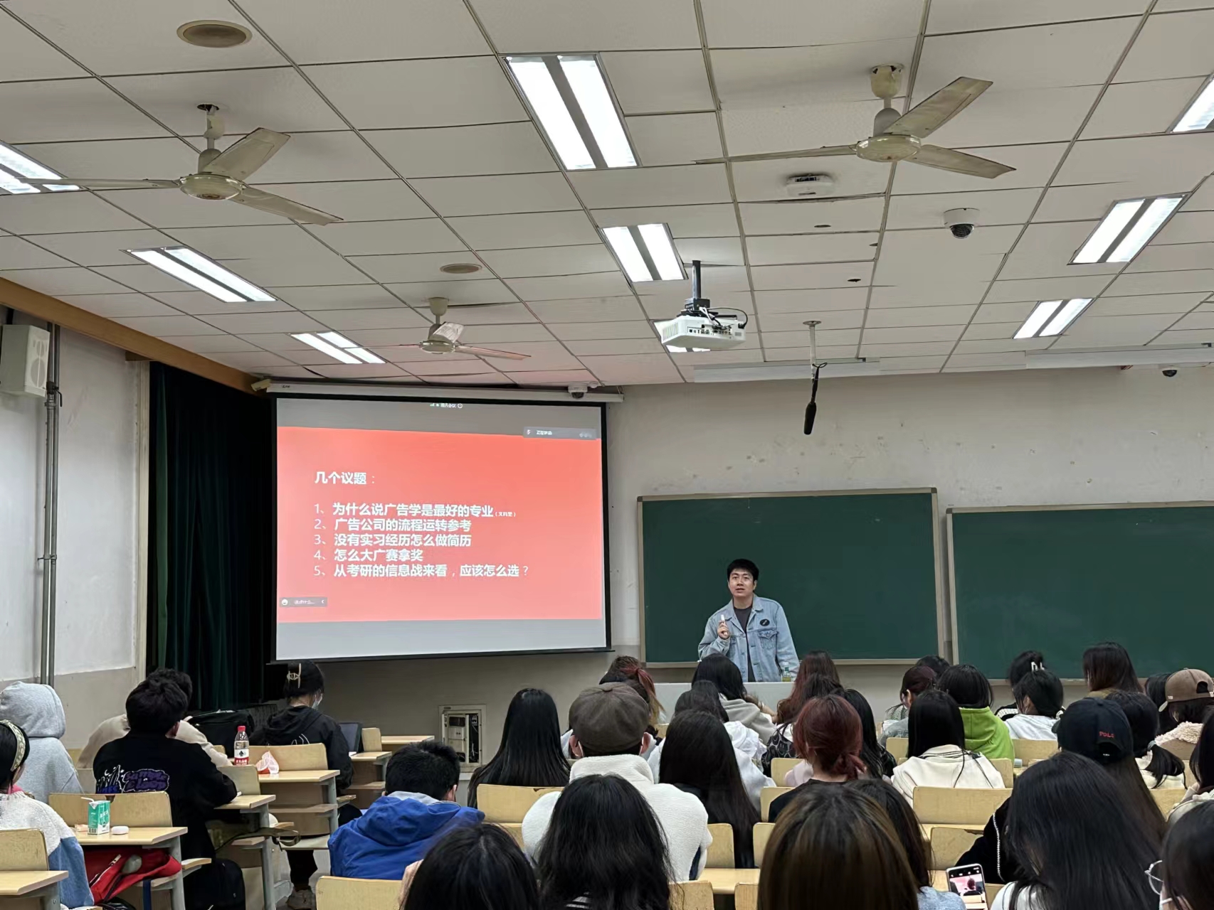 邀请WMY创意热店创意总监、BIGDOOR大门互动策略顾问李鑫先生面向广告学专业师生进行了一场创意分享会。本次分享会围绕广告学专业的优势、广告公司的运作流程、实习简历的设计制作、大广赛参赛经验、考研与就业的选择等问题展开。广告学专业2021级全体学生、广告学专业负责人陈晓洁、广告学专业实习负责人刘水清积极参与并认真聆听了本次分享会。