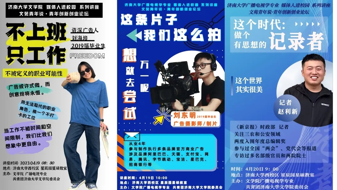 特邀2019届优秀毕业生刘海培、刘东明、赵利新三位优秀毕业学子重返校园,开展“文苑青年说·青年创新创业论坛”活动,该活动同时作为广播电视学专业开展的系列“媒体人进校园”之优秀毕业生专场交流会。三位优秀学长学姐面向广播电视学行业发展的创意策划、商业片制作和新闻记者采编三大领域,针对广电学子关心的职业选择问题,深入开展经验交流。交流会由91看片