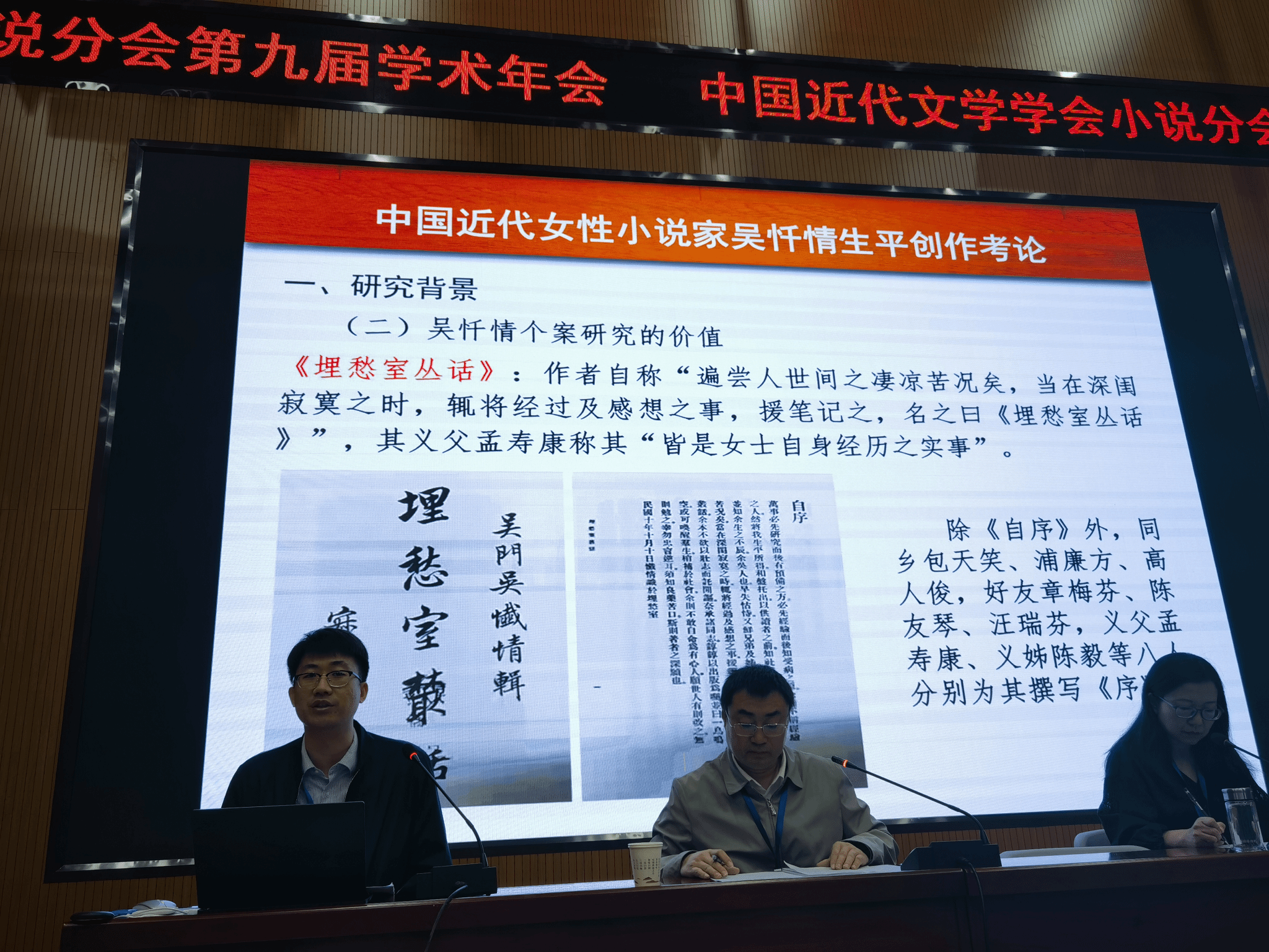 承办,与会代表近百人。郭浩帆教授作了题为《<新新小说>主编龚子英生平考述》的大会发言,鲁毅作了题为《中国近代女性小说家吴忏情生平创作考论》的大会发言。王国伟主持了小组讨论,并作了题为《论近代女性翻译文学史上独特的<第一百十三案>》”的发言。