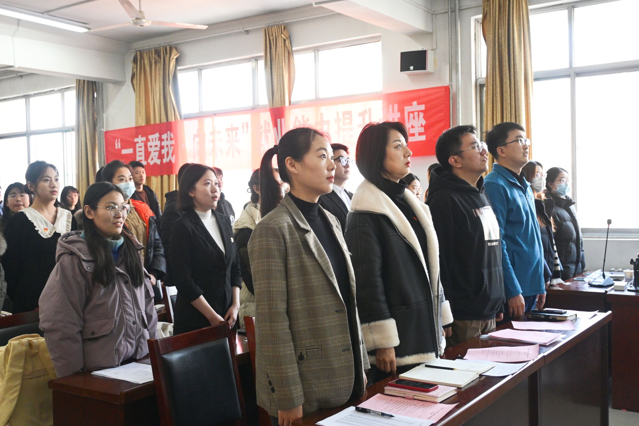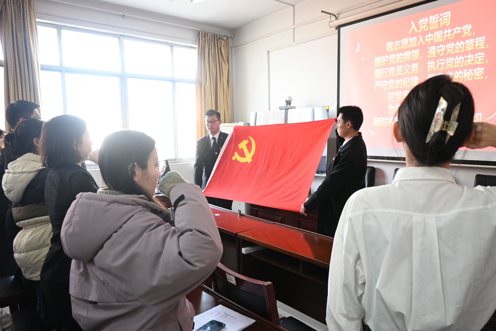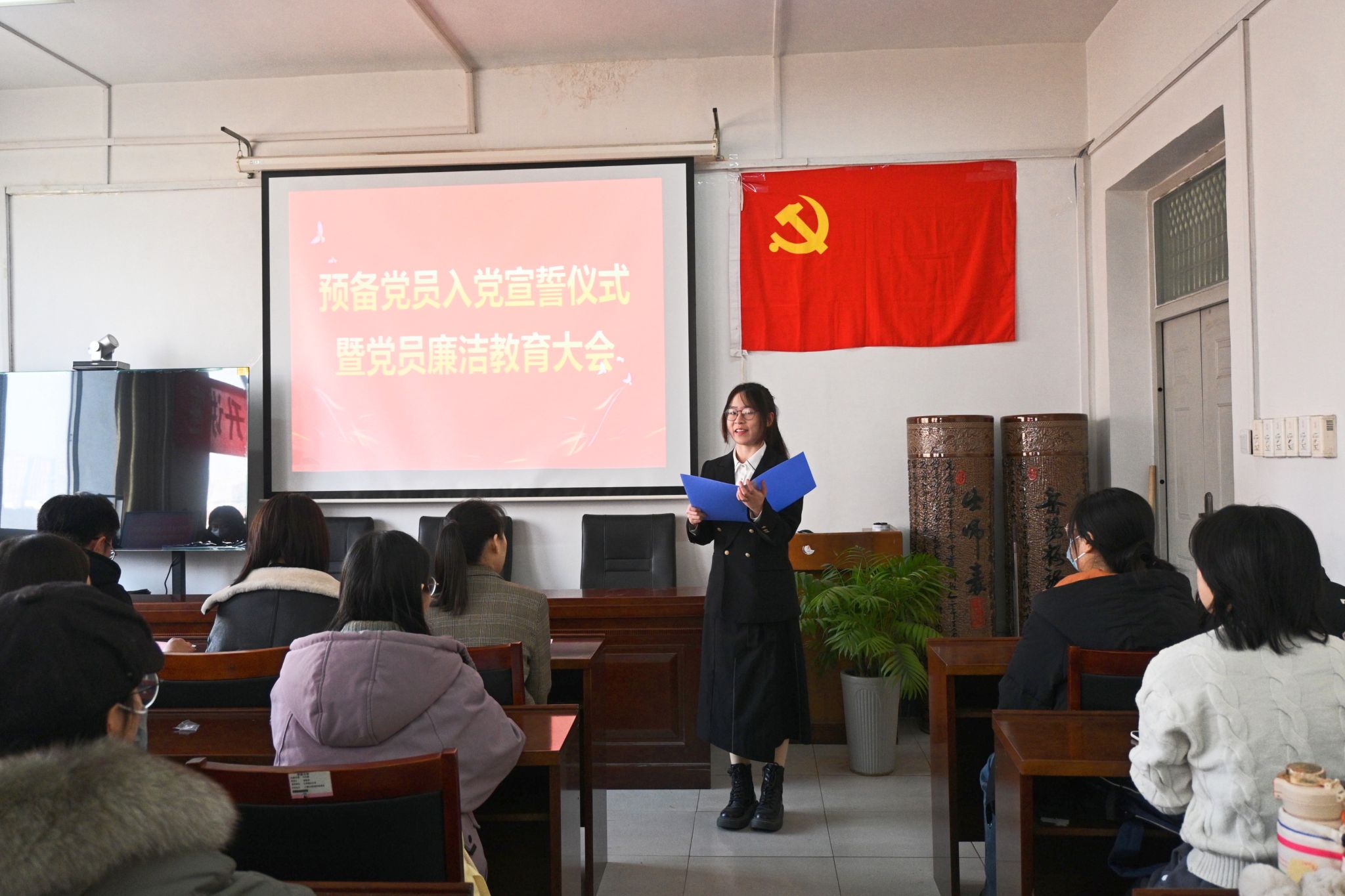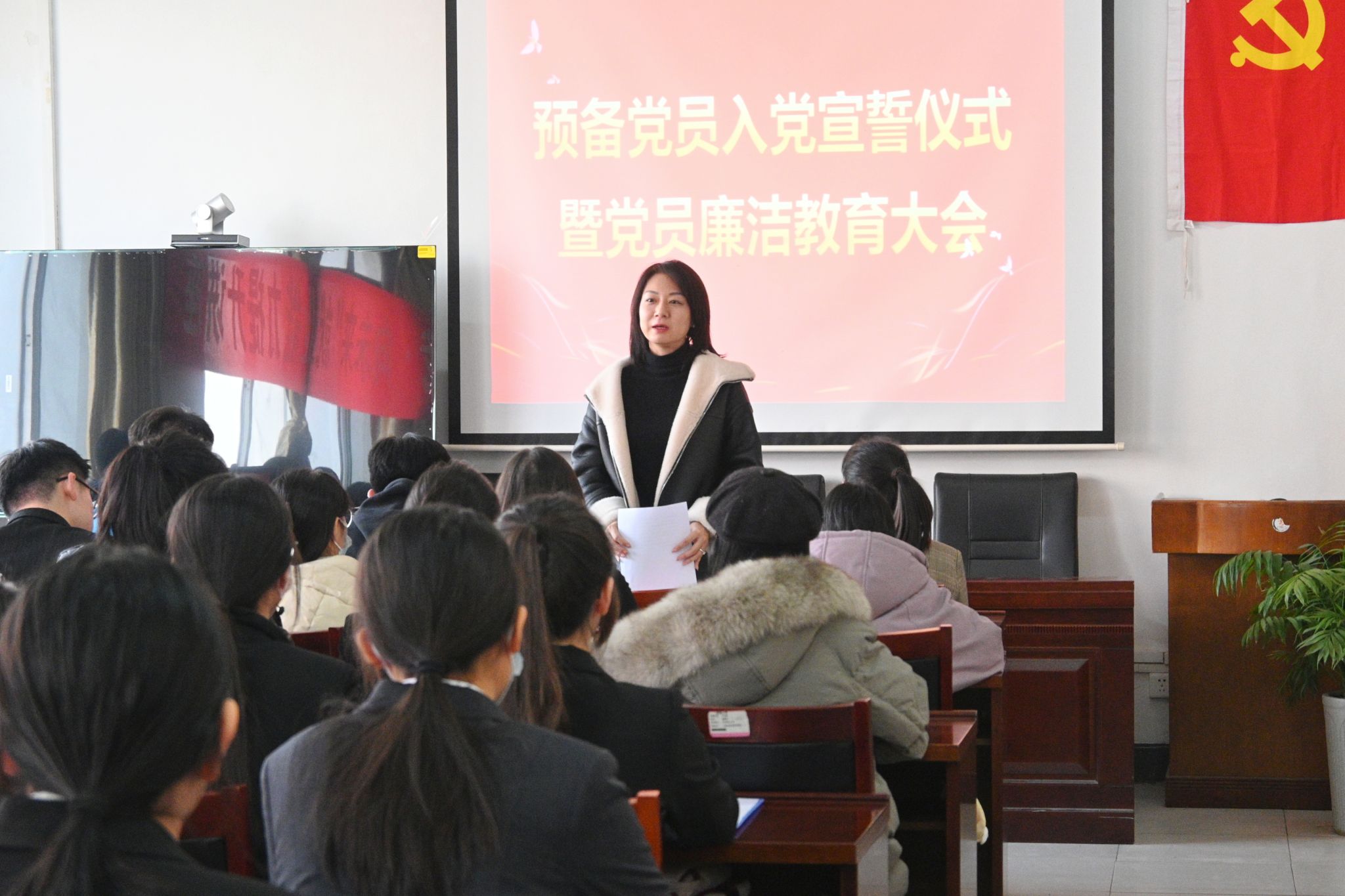 12月12日,91看片 在舜耕书院举行2023年下半年预备党员入党宣誓大会暨学生党员廉洁教育活动,学院党委副书记、副院长潘颖,各学生党支部书记,学生党员代表以及本学期新发展的56名预备党员参加会议,会议由91看片 学办主任兼团委书记敖游主持。