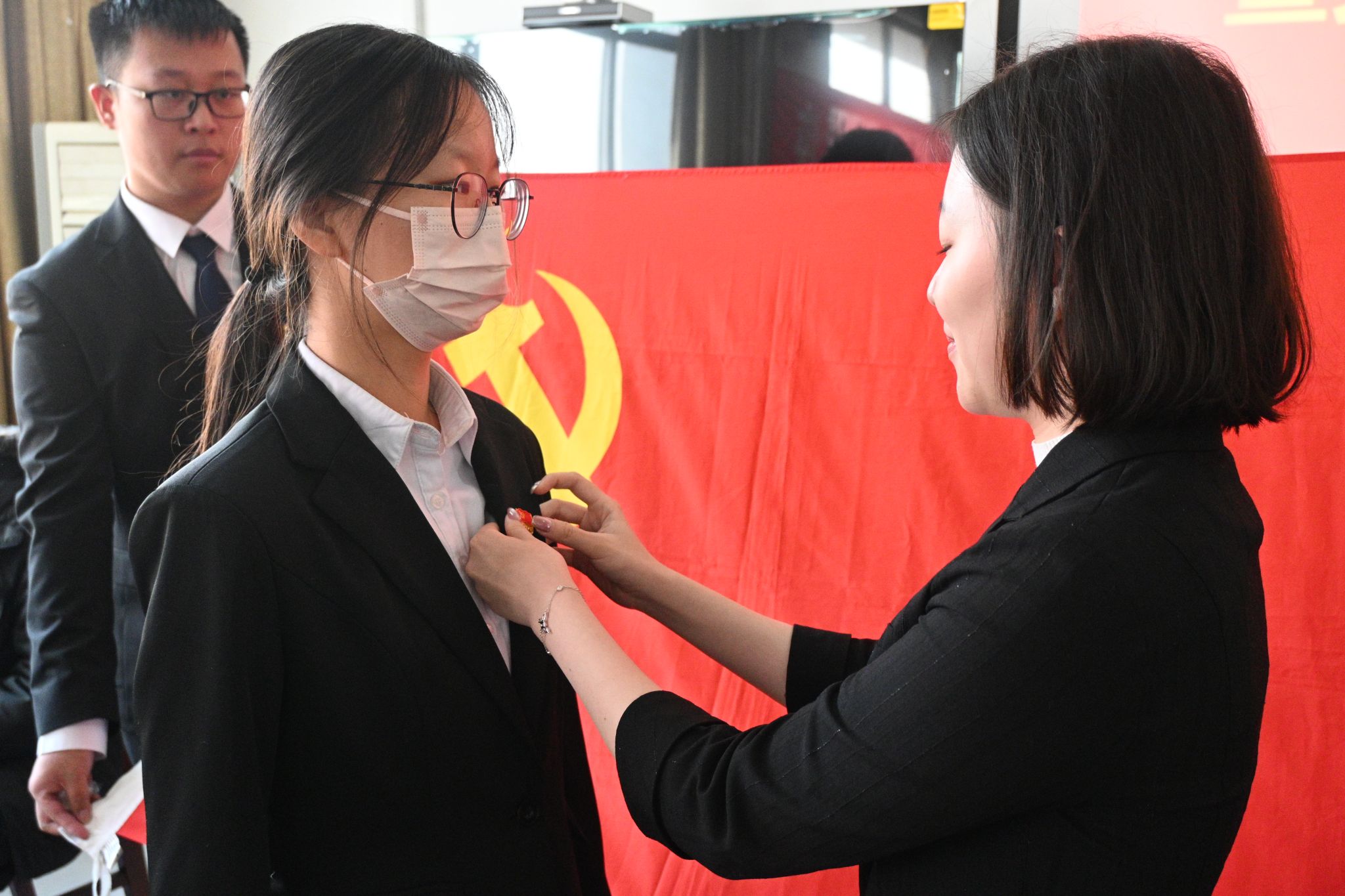 入党宣誓大会在庄严的《国际歌》中拉开序幕。首先,学生中文党支部书记张莉同志宣读宣誓人员名单。随后,各党支部书记和学生党员代表为本次新发展预备党员佩戴党徽,不仅体现了精神传承,更是一种荣誉、一种激励、一种鞭策。在新发展党员代表秦文迈的领誓下,全体预备党员面向鲜红的党旗,举起右拳,进行庄严宣誓。“我志愿加入中国共产党,拥护党的纲领,遵守党的章程,履行党员义务……”铿锵的誓言、坚定的承诺,带领着党员同志们回溯精神的根脉,激发前行的动力,坚定理想信念,牢记使命担当。宣誓结束后,学生中文党支部兰翊君作为预备党员代表发言,表示将牢记党的初心使命,志存高远、积极进取、脚踏实地,努力成为新时代社会责任的担当者与履行者。