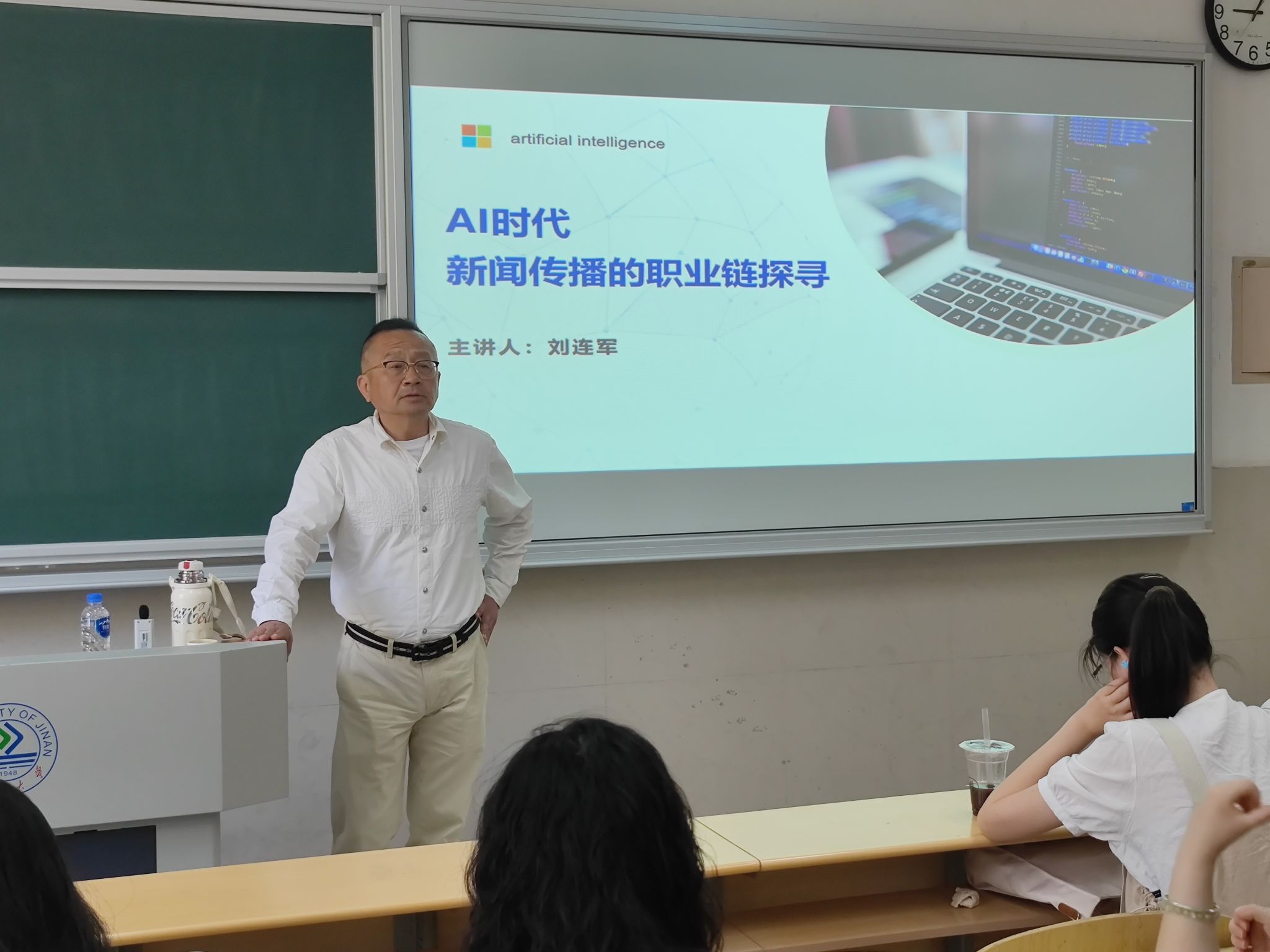 本次讲座由广播电视学专业负责人孙佳祺老师主持,22级广电专业学生全体参与。在正式开讲前,刘连军老师先就AI技术的发展,尤其是机器学习和自然语言处理的进步,正在改变新闻工作者的工作方式进行简单的介绍。通过刘连军老师在讲座中分享的相关视频,学生们了解到了从自动化新闻生成系统到智能推荐算法,AI技术的应用使得新闻内容的生产和分发更加高效。在讲座中,刘连军老师强调了在这样的背景下,新闻传播专业人才需要具备的技能和素养。