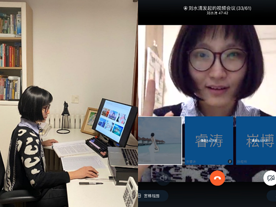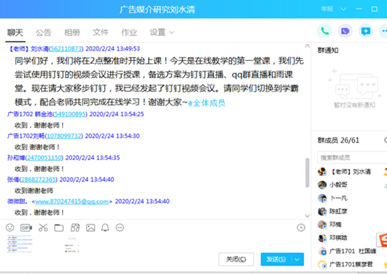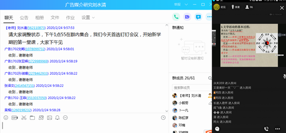 广告学教研室的刘水清老师为广告1701-02 班学生讲授了《广告媒体研究》课程。刘老师讲述自己的授课体验:“今天我一直用的钉钉视频会议,感觉交互性很好,操作也简单,同学们普遍反映很少出现卡顿现象。钉钉视频会议可以作为老师们的备选方案。”