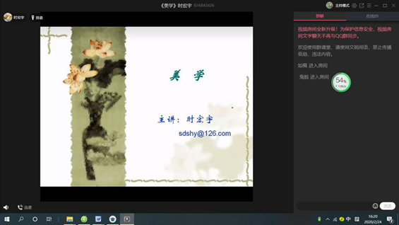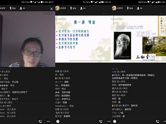 文艺学教研室的时宏宇老师为汉语1801-02班的学生讲授了《美学》课程。时老师运用QQ群课堂进行线上授课,她讲道:“课件、视频都能播放,在线语音和在线视频还比较流畅,教学效果较好。”