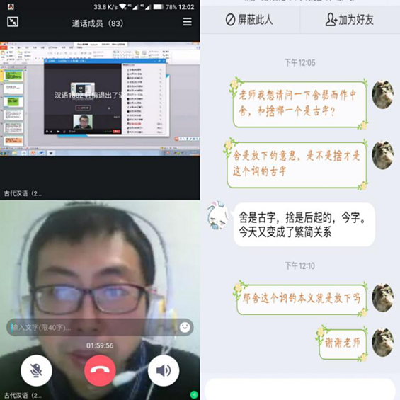 汉语教研室的高龙奎老师为汉语1801-02班的学生讲授了《古代汉语》课程。高老师讲:“为了响应停课不停教,我们教研室假期就一直通过QQ直播等方式召开研讨,大家积极探讨线上教学方式,不断与学生沟通,调试直播方式。最终选择QQ直播、腾讯会议等方式作为线上教学的主要手段。今天正式开课了,我们也荣幸的成为主播,演绎了一场别开生面的开学第一课,感受颇多。”