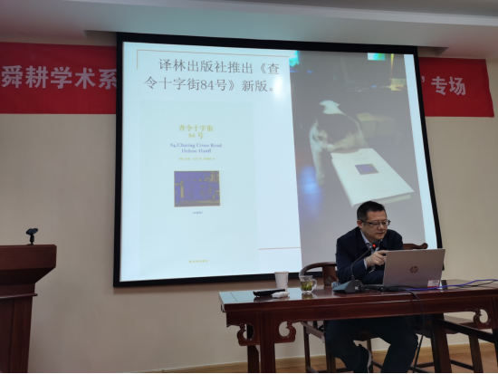 第一场讲座“《查令十字街84号》创作、出版与传播”,由叶新教授主讲。首先,他简介《查令十字街84号》以及自己的“84号”主题收藏、“84号”在西方的创作与传播、“84号”在华人世界的传播、自己的“84号”写作与传播,并介绍将编纂《朝圣查令十字街》及后续选题,启发大家书影同读并留意影视和文学的异同,展示了“一个关于书籍出版意义的个案研究”、“一个跨文化出版的个案研究”、“一个书籍精读与写作的个案研究”,通过大量的图文信件资料,复原了经典文本的创作始末和传播轨迹。