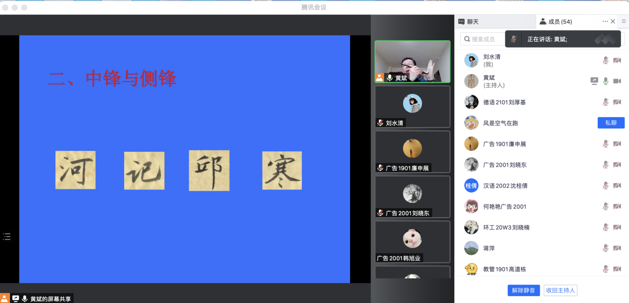 黄斌教授的报告主要围绕碑与帖、中锋与侧锋、起笔与收笔、快与慢、连贯与连带等五部分展开,不仅向广大师生传授了书法技法知识,还提升了师生的人文素养和审美水平。黄斌教授亲切的讲授方式、认真谦逊的态度和饱含哲理的书法理念,给同学们留下了极为深刻的印象。