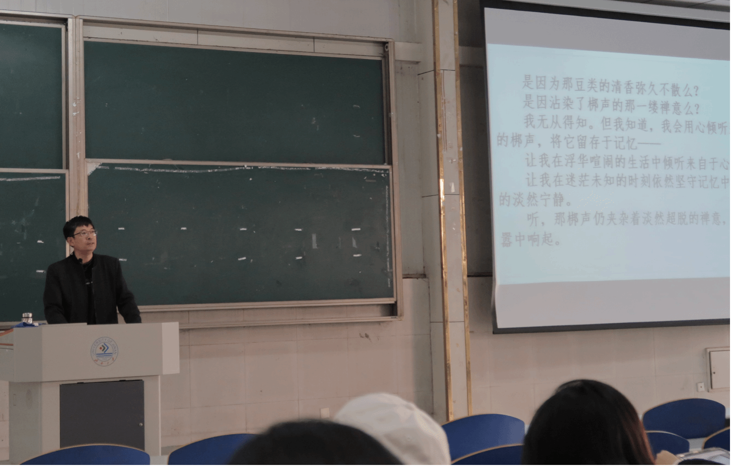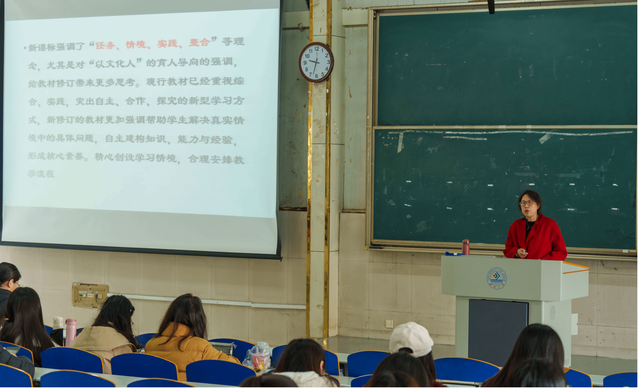 11月18日下午、11月22日下午,分别邀请第十二届山东省师范类高校学生从业技能大赛高中组一等奖获得者刘骏成和初中组一等奖获得者王文泉进行了备赛经验分享。在教育见习期间,学生自行结合成小组,进行了教学展示,见习指导老师从教姿教态、教学设计、文本分析、作业布置、板书设计等方面进行了点评。