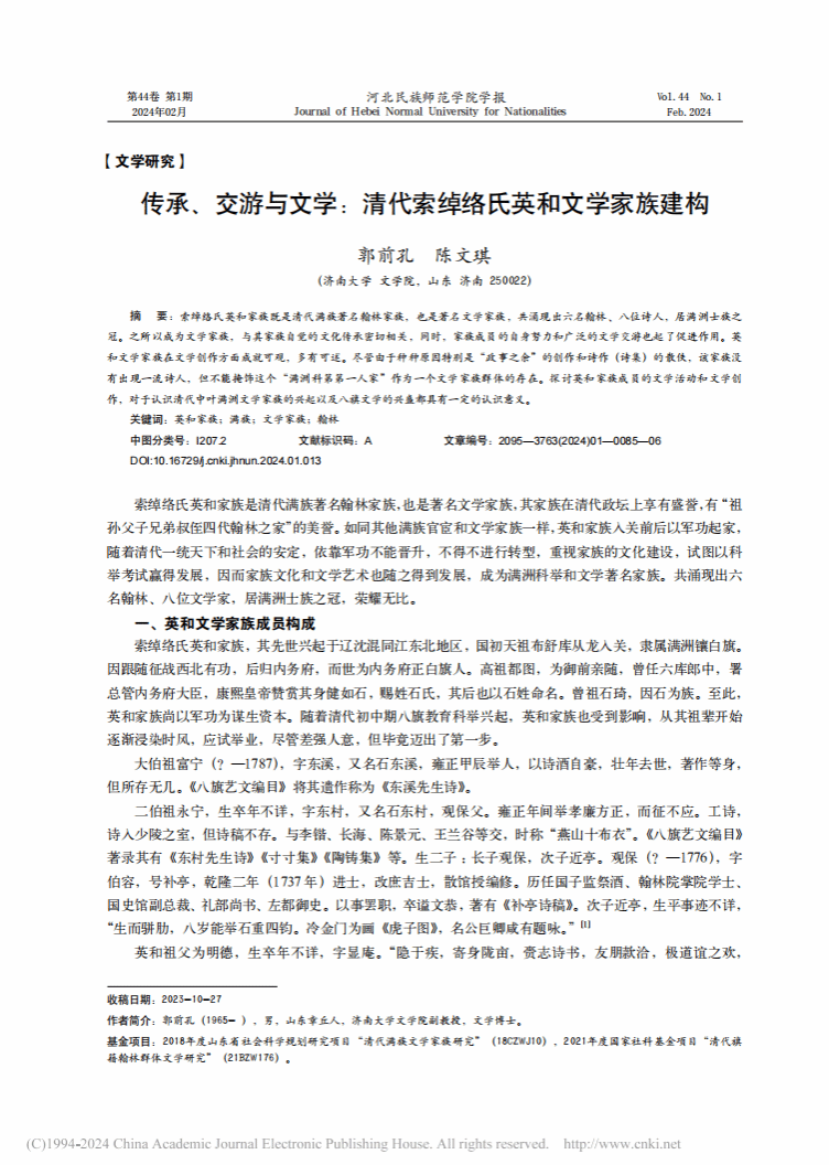 郭前孔副教授的论文《传承、交游与文学:清代索绰络氏英和文学家族建构》于《河北民族师范学院学报》2024年第1期发表。论文为作者所主持的国家社科基金项目“清代旗籍翰林群体文学研究”(21BZW176)、山东省社会科学规划研究项目“清代满族文学家族研究”(18CZWJ10)的阶段性成果。