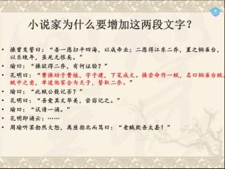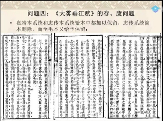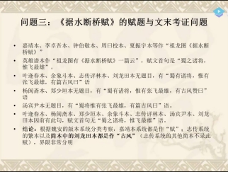 王教授进一步探讨《据水断桥赋》的赋题与文末考证,为了让学生们有更深刻的思考,详细介绍了《据水断桥赋》的作者以及与小说情节相关联的问题;得出结论,根据魏安的版本系统分类考察,嘉靖本系统都是作“赋”;志传系统的繁本以及简本中的刘龙田本都是作“古风”,界限非常分明。关于《大雾垂江赋》的存废问题,他认为各有原因。小说文本的赋,参与情节的建构,成为故事的一部分,失去了一定的独立性。这是中国古代文学的文体传统。