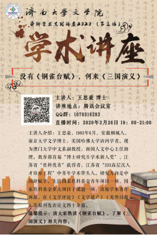 “舜耕学术系列讲座2020”第三场如期举行。哈佛大学访问学者、澳门大学中文系副教授、南国人文中心主任助理王思豪主讲,围绕《没有<铜雀台赋>,何来<三国演义>》展开。讲座采用腾讯直播的形式,91看片