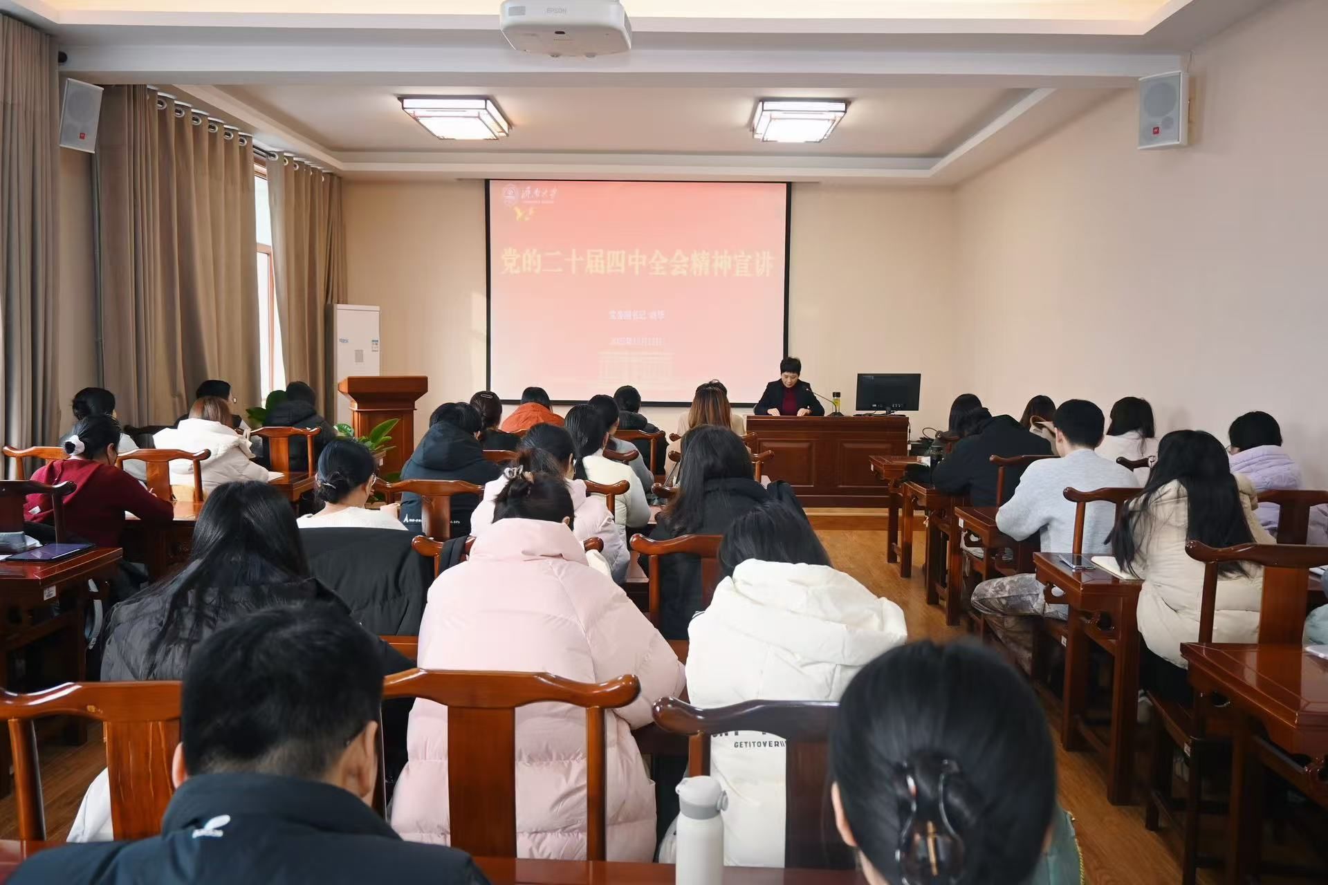 研究生党支部讲授党的二十届四中全会精神专题党课。支部全体党员参加了此次学习。党委宣传部副部长马杰陪同,学院领导班子成员一起聆听授课。