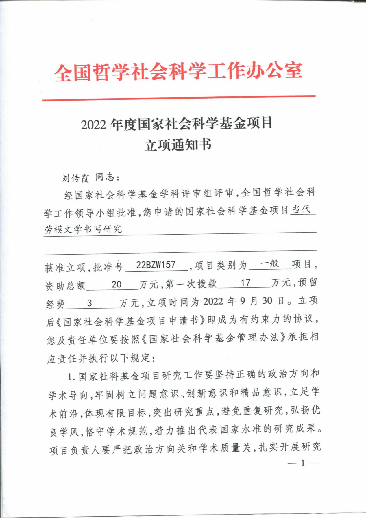 刘传霞教授主持的国社科项目“当代劳模文学书写研究”(项目编号为:22BZW157),该项目反思文化激进年代的“泛政治化”文学研究以及消费主义时代“去政治化”“无思想化”的纯粹文学研究,回到具体历史语境,在历史与社会结构之中分析当代劳模文学书写;通过当代文学劳模书写的整体性研究,重申审视中国社会主义文学实践的独特性和文化意义;打通文学研究与政治思想研究、社会文化研究、历史研究之间的壁垒,探讨中国劳模文化、劳模精神的构建历史以及在“新时代”的继承与发展。