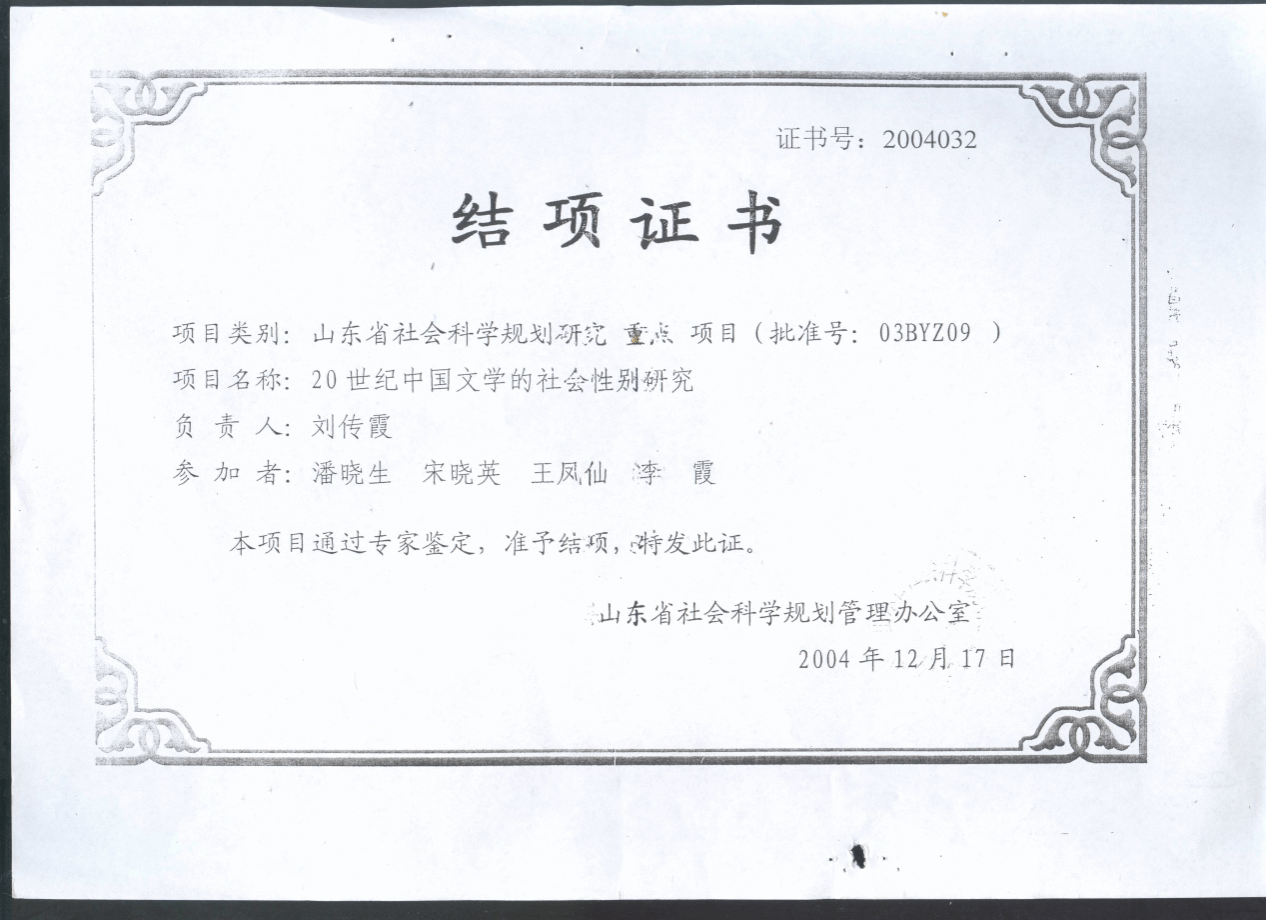 主持国家社科基金“马克思主义女权主义视阈中的‘十七年’女作家创作研究”、“当代文学劳模书写研究”,教育部人文社科基金“中国当代文学男性形象再现研究”、“中国当代文学身体政治研究”,山东省社科规划项目“社会转型与文化多元中的女性文学研究”“身体叙事与自我认同”“论中国文学现代性叙事与性别建构”“20世纪中国文学社会性别研究”。专著《中国当代文学身体政治研究》获得山东省社科优秀成果二等奖,专著《被建构的女性:中国现代文学社会性别研究》《女性·历史·叙事》、论文《论现代文学叙述中妓女形象谱系与话语模式》分别获得获得山东省社科优秀成果三等奖。出版《中国当代文学身体政治研究》《被建构的女性:中国现代文学社会性别研究》《女性·历史·叙事》等专著3部,在《南开学报》《文艺争鸣》《当代作家评论》《妇女研究论丛》《小说评论》等刊物发表论文百余篇,被人大报刊资料《中国现代、当代文学研究》《影视文学》《文艺理论》全文转载以及《现当代文学文摘》摘录10余篇。