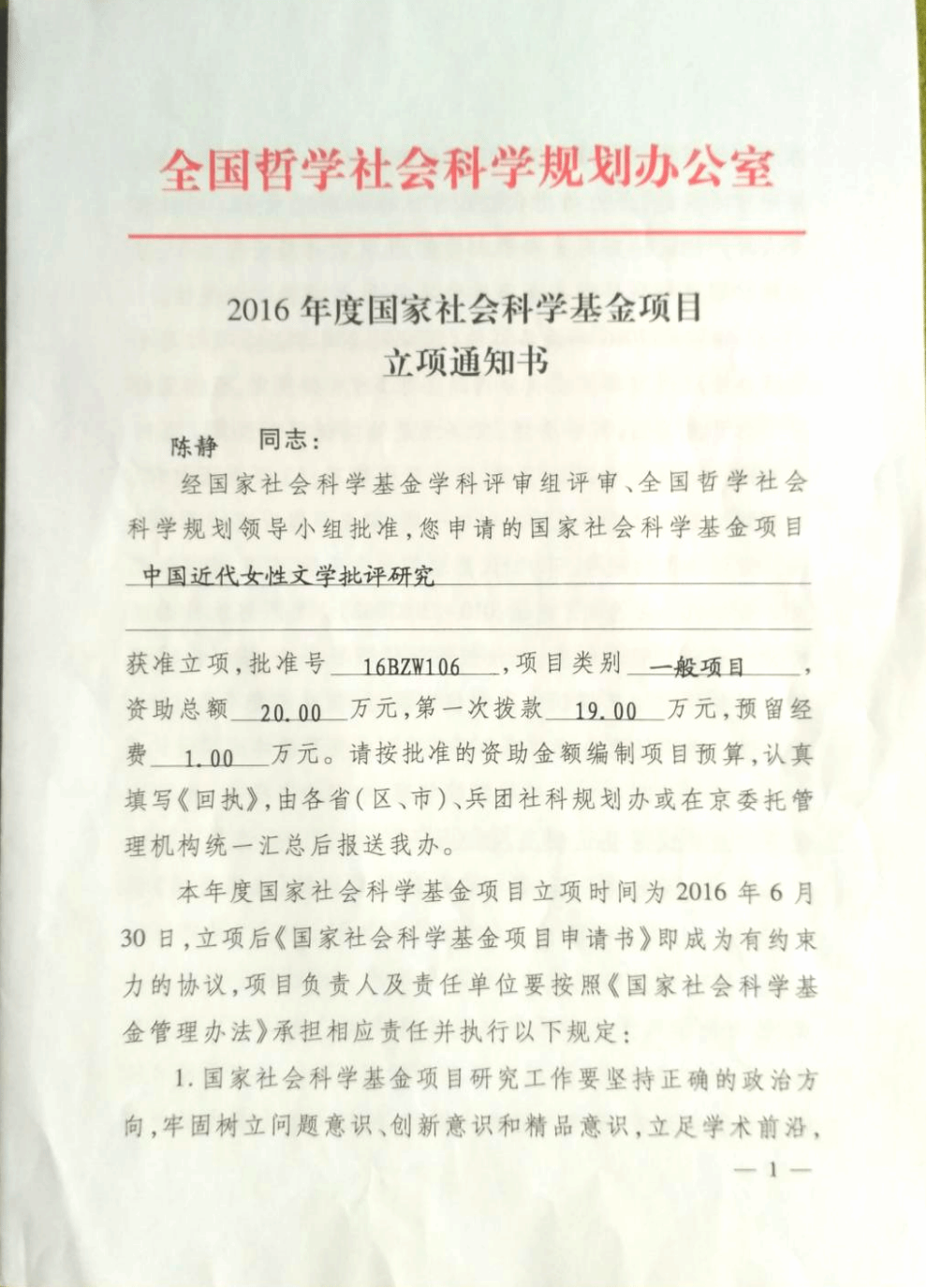 陈静教授主持的国家社会科学基金项目“中国近代女性文学批评研究”(16BZW106)于2016年立项,2022年9月结项,鉴定等级为良好。项目成果为专著《中国近代女性文学批评研究》(待出版)。这是第一部系统研究中国近代女性文学批评的专著。